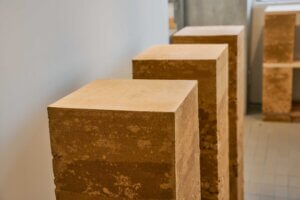 印象的なマテリアルとしては作品展示台に輪島産の土砂を使用。